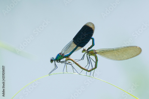 Banded demoiselle damselfly pair mating on plant