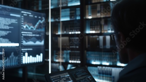 Banker in close-up reviewing financial documents, serious expression, legal books and digital screen in background, emphasizing compliance and financial regulation.