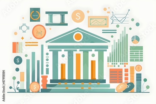 Banking business, finance, and investment concept, flat design illustration, eye-level angle, soft gradients, calm blues and greens, detailed yet uncluttered, sophisticated and elegant, vector graphic