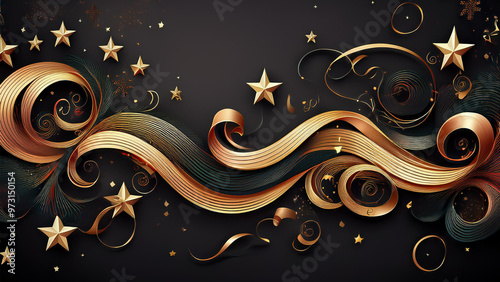 Banner de Natal com fitas e estrelas douradas, fundo escuro. Festividades de final de ano, natalino, cartão saudações. Banner website, fundo de tela, proteção de tela.
