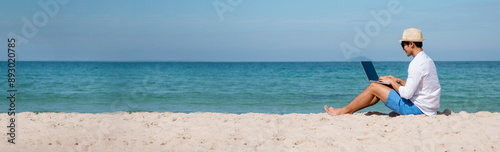 Banner Man traveler use laptop on summer beach blue sky. Asian man travel relax sitting summer beach island. Man typing laptop computer holiday business trip freelance working online with copy space