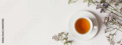 Banner with Cup of tea on a white table surrounded by flowers