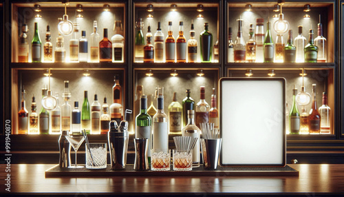 bar, counter, bottle, shelf, alcoholic, beverage, goggles, cocktail, shaker, accessory, illuminated, blank, menu, board, drink, served, design, display, customizable, text, hospitality, setting, inviting, stylish, elegant, modern, clean, simple, aesthetic, versatile, practical, everyday, establishment, decor, space, arrangement, layout