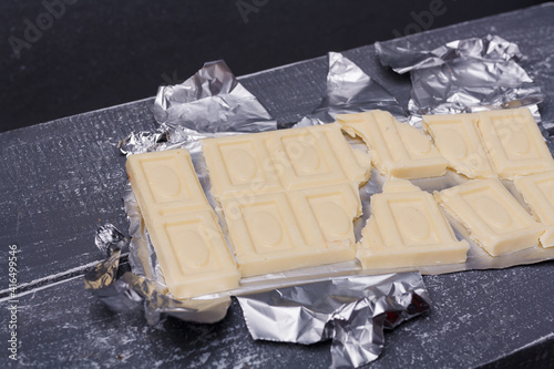 Bar of broken white or coconut chocolate on foil on grey wooden background. Unique sweets, unusual chocolate flavour