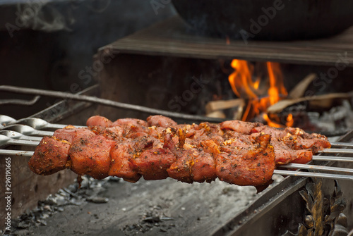 Barbecue fries in the coals. Meat and beef at the field kitchen festival.