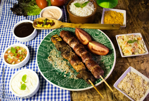 food, meat, dinner, meal, plate, dish, beef, cookery, rice, chicken, salad, pork meat, tomatoes, vegetable, lunch, grilled, steak, delicious, cooked, fried, sauce, healthy, fresh, epicure, fish, bar-b-q, stick