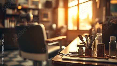Barber shop interior with a vintage chair and close-up of styling tools under warm golden lighting.