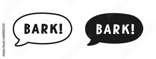 Bark text in a speech bubble balloon outline and silhouette set. Cartoon comics dog sound effect lettering. Simple flat vector illustration.