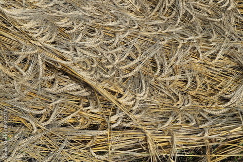 Barley ears lie from the wind after the rain. Yellow, ripe barley.