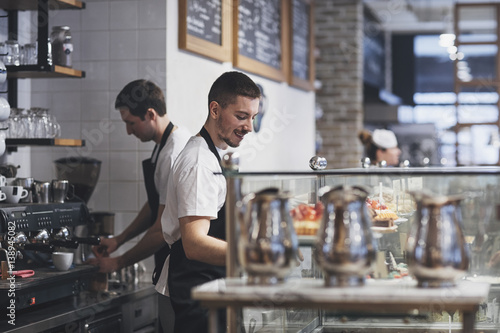 caucasian, apron, baker, bakery, bar, barkeeper, barkeeper, barkeeper, cafes, hot drink, cafes, colleague, cup, drink, enjoy, espresso, food and drink, photogenic, happiness, happy, horizontal, indoor, joy, machine, constructed, maker, man, people, profession, professional, eatery, smile, smiling, white, work, young