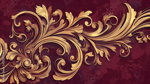 Baroque-style golden floral scrollwork on a rich red textured background, ideal for luxurious and elegant designs