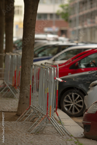 Barricades are used to separate parked cars along a busy street in an urban parking area, indicating possible restrictions or ongoing construction work taking place nearby