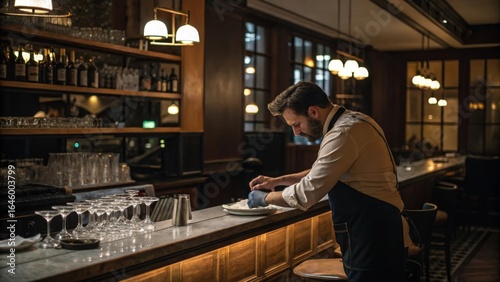 barkeeper, bar, counter, glassware, plate, glove, white shirt, apron, beard, shelf, goggles, shaker, lighting, indoor, eatery, dark, illumination, prepared, preparation, attentive, sharpened, professional, business, service, hospitality, occupation, work, beverage, drink, alcohol, uniform, aged, vintage, style, classic, elegant, interior, window