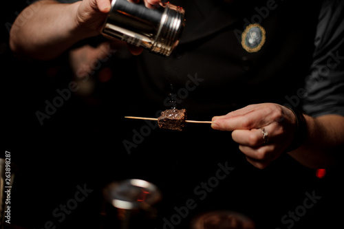Bartender sprinkles piece of chocolate on a toothpick