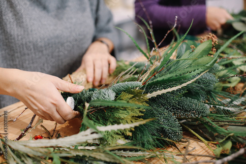 Base for Christmas wreath. Christmas decorations. Christmas wreath. Florist making Christmas wreath. View of female hands make a wreath.