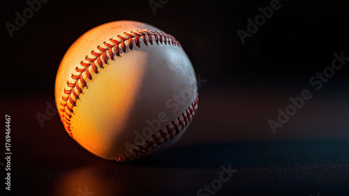 Baseball ball on black surface with dramatic light creates striking visual. texture and stitching are highlighted beautifully