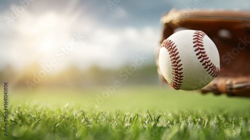 Baseball in mid-air flying towards a glove, with a green field and a bright sunburst background