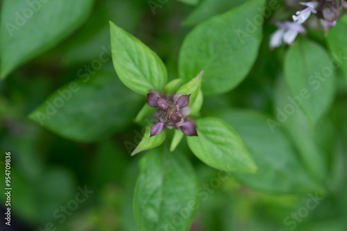 Basil leaves and flower with branch on tree in organic garden selective focus blurred background