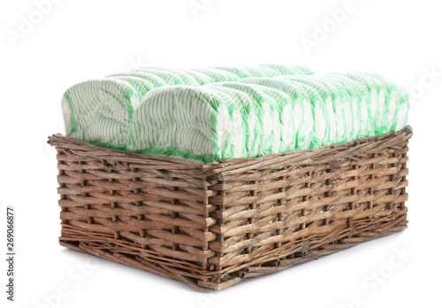 Basket with diapers on white background. Baby accessories