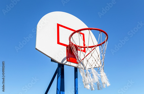 arena, backboard, basketball, basketball hoop, bright, common, concept, high, modern, new, nobody, outdoors, perspective, playground, sky, sport, tall, town, urban, view, youth culture, equipment, game, play, recreation, hoop, net, competition, court, white, red
