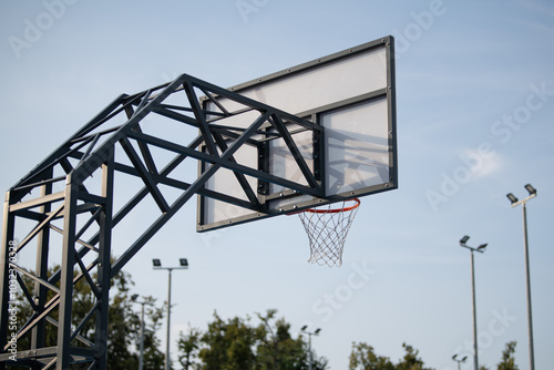 backboard, hoop, basket, basketball, board, ball, championship, cloudy, competition, court, game, league, construction, sky, blue, sport, steel, metal, equipment, iron