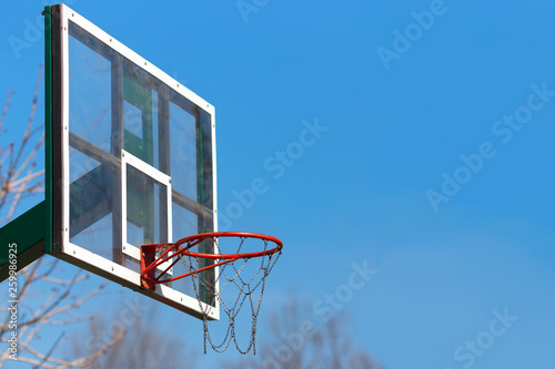 basketball, hoop, backboard, sport, basket, competition, net, sky, blue, board, court, game, play, equipment, recreation, background, goal, playground, rim, ring, space, round, park, street, circle, closeup