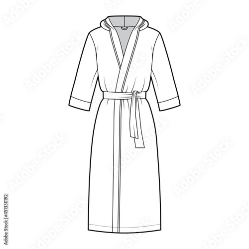 Bathrobes hooded Dressing gown technical fashion illustration with wrap opening, knee length, oversized, tie, elbow sleeves. Flat garment apparel front, white color. Women, men, unisex CAD mockup