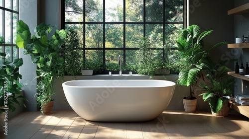 bathroom with freestanding bathtub and lush greenery. The interior is spacious and bright Bathroom in loft style.