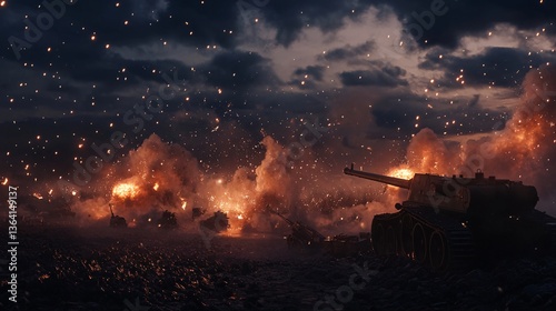 battle, warfare, landscape, chaos, dusk, flames, mission, courage, engagement, victory, force, loss, nation, peace, darkness, strategy, fight, tension, attack, smoke, struggle, military, front, ground, power, fire, shadow, action, advance, conflict, destruction, threat, bravery, operation, tank, enemy, survival, history, combat, night, troop, terrain, tactic, aftermath, clash, liberation, stronghold
