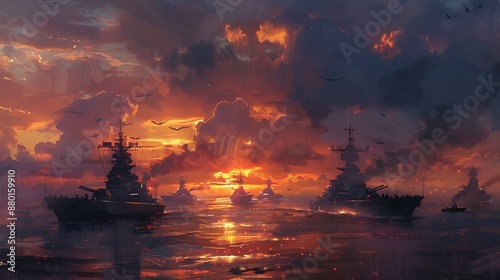 battleship, sunset, sea, fleet, sky, ocean, cloud, water, horizon, ship, military, war, silhouette, dark, orange, red, gold, light, art, digital, painting, illustration, fantasy, dramatic, epic, powerful, peaceful, calm, tranquil, serene, bird, flying, mist, smoke, fire, glow