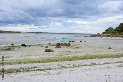 Bay in Brittany, small boats in the low tide, rocks and trees
