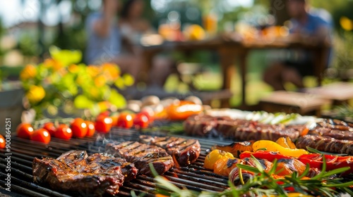 BBQ Grill with Savory Meat and Vegetables, Outdoor Picnic Setting with Friends in Background. Concept of Barbecue, Outdoor Cooking, Social Gathering, Summer Party