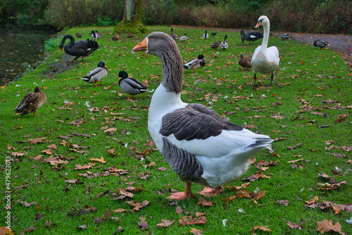 bird, goose, duck, animal, nature, grass, beak, water, wildlife, white, feather, green, game, cygnet, farm, fowl, park, see, water bird, neck, young