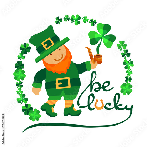 Be Lucky. Hand-drawn lettering. Festive composition with cute leprechaun, clover shamrock, and horseshoe isolated on white background. Spring holiday March 17 Saint Patrick Day. Vector illustration.