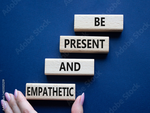 Be Present and Empathetic symbol. Concept words Be Present and Empathetic on wooden blocks. Businessman hand. Beautiful deep blue background. Business concept. Copy space