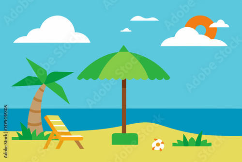 beach, sea, summer, palm, island, tree, sun, sand, tropical, water, ocean, sky, travel, vector, illustration, landscape, vacation, nature, wave, holiday, umbrella, relax, resort, paradise, coast