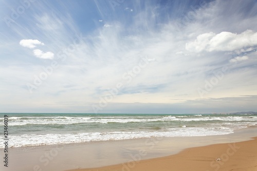 beach, sea, sand, sandy, water, ocean, wave, shore, coast, summer, sunny, cloud, blue, sky, laundered, travel, vacation, mediterranean, valencia, beautiful, resort, landscape, waterscape, nature, seascape, scenery, scenic, hot, weather, background, horizon, sunshine