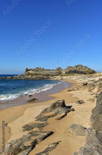 Beach and prehistoric settlement ruins. Castro de Baroña, Coruña, Spain.