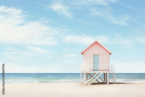 beach, architecture, house, building, colours, aesthetic, nature, ocean, sea, sky, illustration, minimal, texture, blue, lifeguard, outdoors, scenery, summer, travel, cloud, water, pink, wood, holiday, downloadable, countryside, sunlight, horizon, bright, pastel, crayons, coast, grain, noise, photo, land, sand, hut, building exterior, clear sky, vacation, fresh, tower, image, calmness
