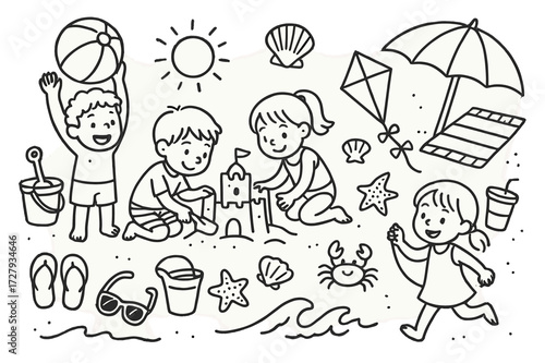 Beach Play Doodle. Hand-drawn doodle illustration Kids playing at the beach sandcastle, bucket, shovel, ball, kite, seashell, starfish, crab, sunglasses, flip