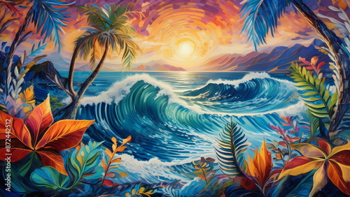 tropical, beach, leaf, sunset, paint, oil, palette, blue, green, sky, cloud, palm, tree, sand, sand, water, sea, colours, vibrant, calm, painting, scene, wave, paradise, lush, foliage, ocean, serene, framed, turquoise, calmness, scenic, idylli, gentle, beautiful, surrounded, nature, coastal, exotic, greenery, seascape, relaxing, peaceful, vacation, natural, tranquil, shoreline