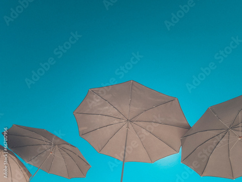 beach umbrellas against the background of a clear blue sky. vacation and beach holiday concept. soft focus.
