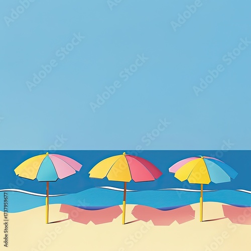 Beach Umbrellas Shade Sand by Ocean. Summer vibes. Ideal for travel promotion