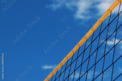 Beach volleyball net close-up. Fragment of a volleyball net on the beach against the blue sky. Sport, beach volleyball. Active recreation concept. Background. Detail of the yellow net. Sports ground