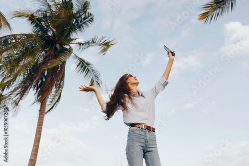 Beach; woman; palm tree selfie a woman joyfully raises her arms while taking a selfie on a sandy beach with a towering palm tree in the background, capturing the essence of a sunny tropical getaway