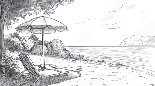 beach, sea, ocean, coast, shore, sand, sun, umbrella, shade, chair, lounge, relax, relaxation, tranquil, peaceful, calm, serene, summer, vacation, holiday, travel, get-away, escape, scenic, landscape, view, picturesque, idylli, paradise, coastal, waterfront, nature, scenery, sky, cloud, rock, tree, greenery, rest, comfort, leisure, solitude, serenity, well-being, unwind, bliss