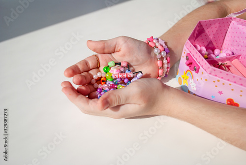 bead bracelets. casket with beads in hands. decorations. bijouterie. hobbies of girls. rings. background