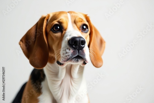 Beagle head shot, attentive expression, droopy ears, light fur , animal photography, headshot