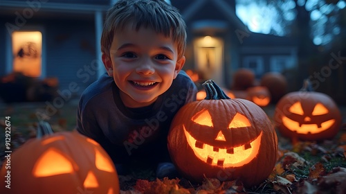 boy, smiling, happy, children, halloween, pumpkin, jack-o-lantern, evening, night, backyard, dark, light, skittish, festive, autumn, fall, seasonal, holiday, children, costume, carving, scarey, carve, decorate, party, game, activity, fun