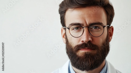 Bearded male scientist in glasses wearing a white coat on a neutral background representing healthcare and medical research profession